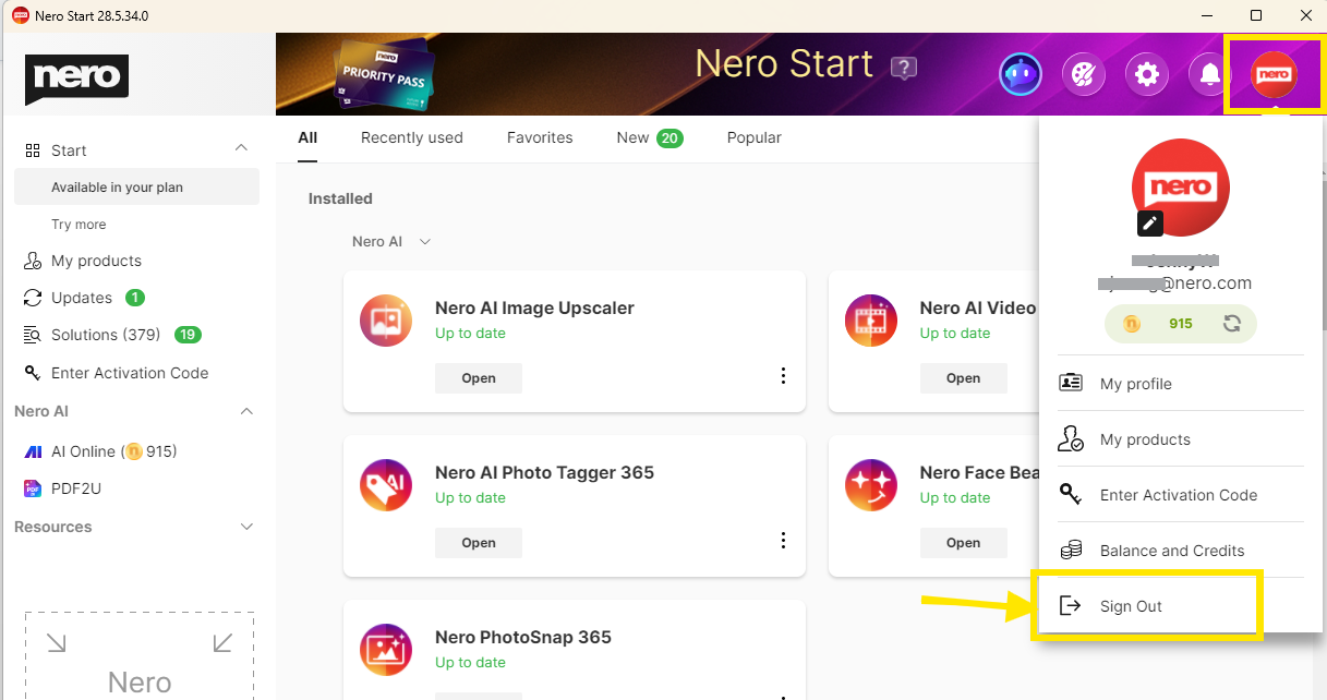 - „Meine Software ist nach dem Anmelden verschwunden.“ – Der häufigste Grund dafür ist eine falsche Kontoangabe. Bitte überprüfen Sie, ob Sie sich mit dem Nero-Konto (E-Mail-Adresse) angemeldet haben, das Sie für den Kauf verwendet haben. Lösung: Melden Sie sich vom aktuellen Konto ab und melden Sie sich mit dem richtigen Konto wieder an.