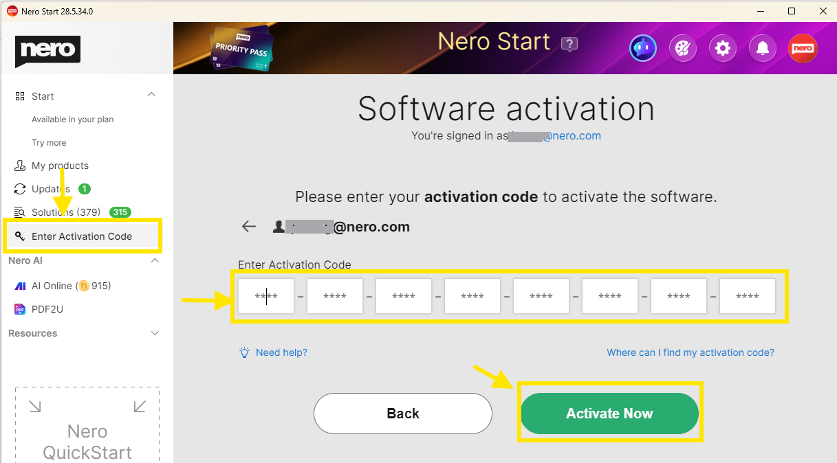 - Suchen Sie in Nero Start den Abschnitt „Aktivierungscode eingeben“ und geben Sie Ihren 32-stelligen Code ein.
