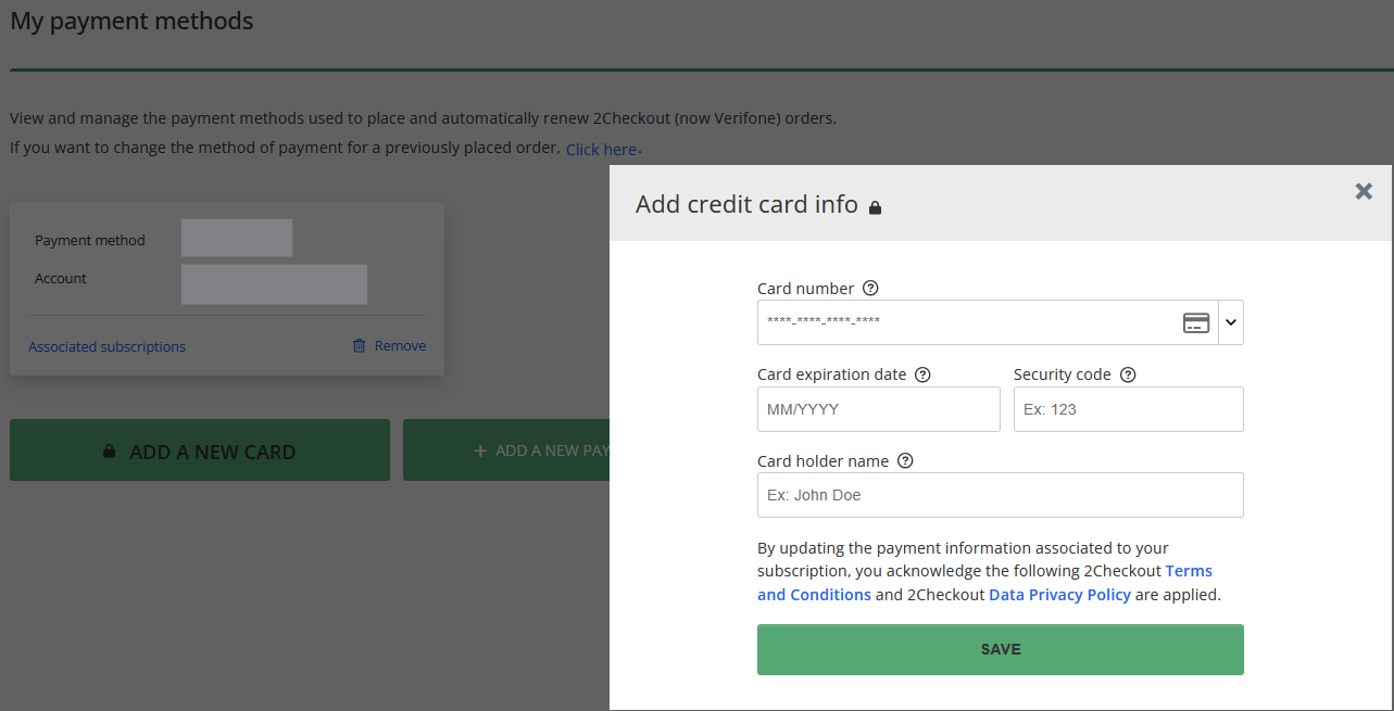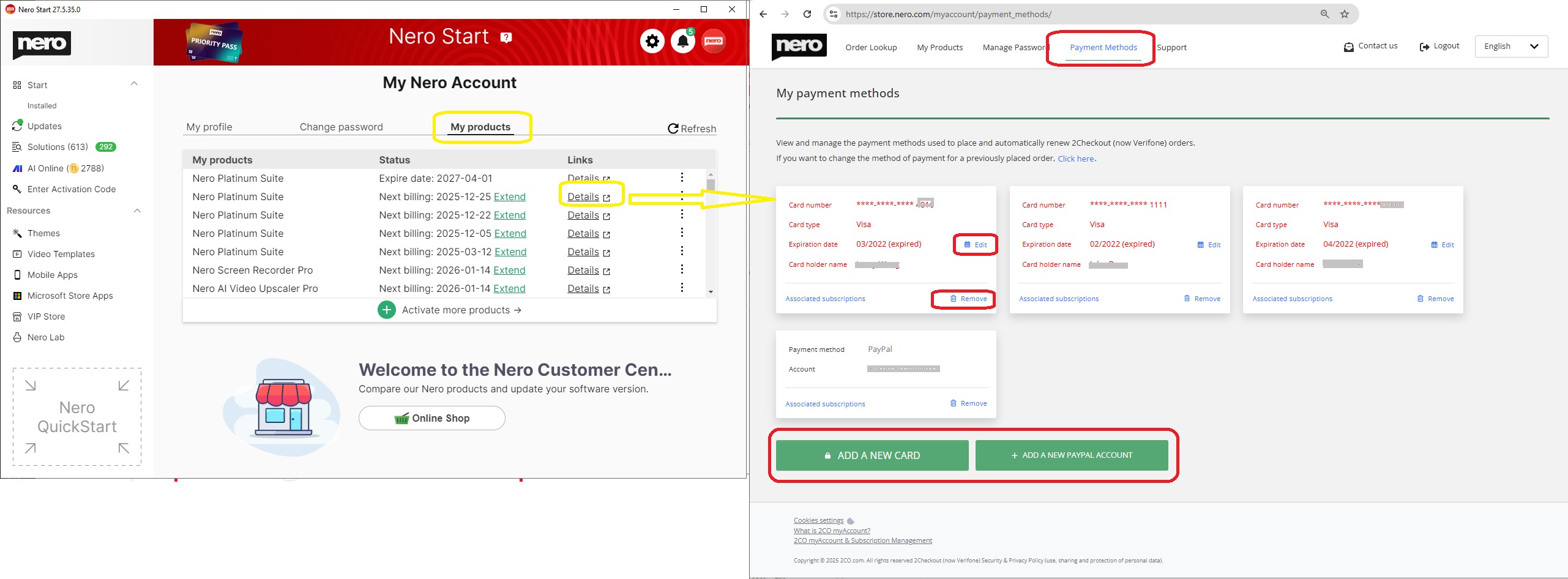 The order management page will open. This webpage is managed by Nero online shopping provider 2Checkout. - Change your payment method on tab Payment Methods