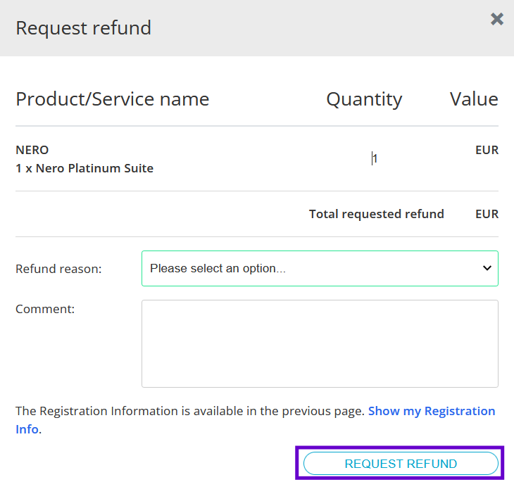 3. Select the refund reason and input the comment, click button of REQUEST REFUND and sent out the request.