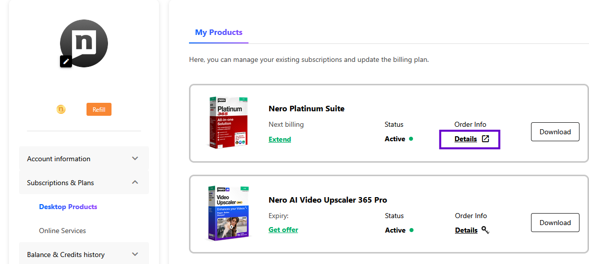 4. Locate your subscription product and select Details.