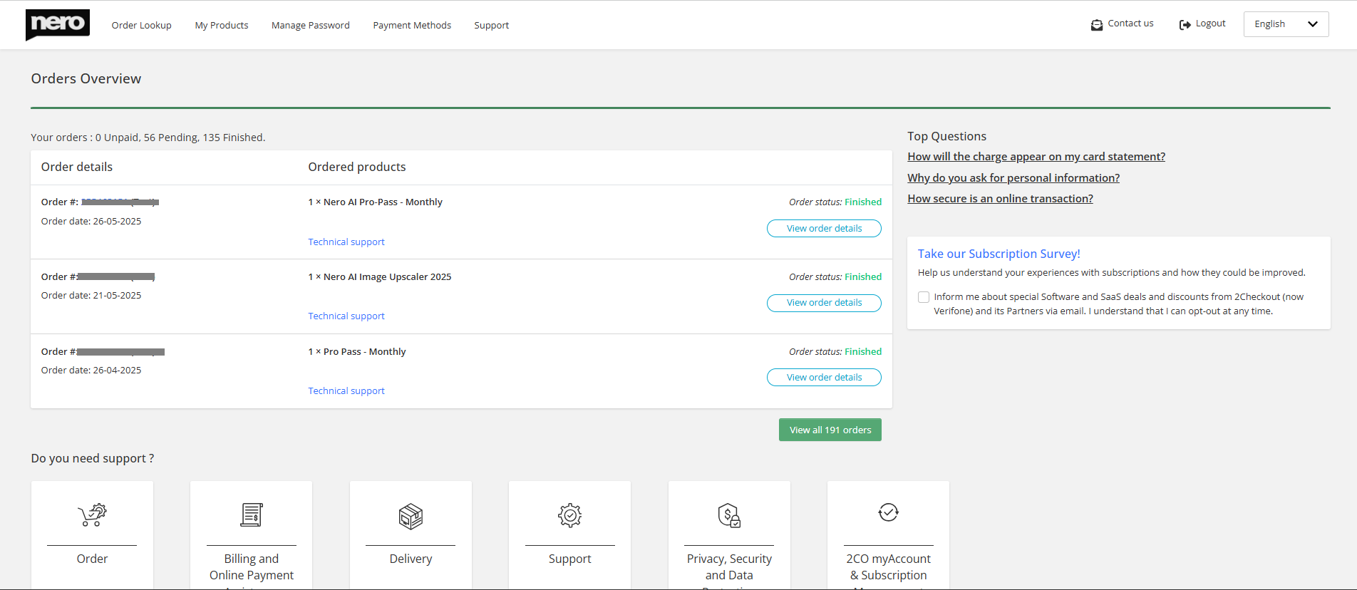 A continuación se muestra un ejemplo de información de producto/suscripción de un pedido. En la parte inferior, también hay información sobre cómo obtener soporte.