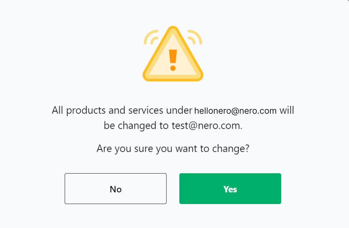 6. Introduzca la nueva dirección de correo electrónico. Haga clic en «Cambiar correo electrónico» y confirme que desea transferir todos los productos y servicios de Nero a la nueva dirección de correo electrónico.