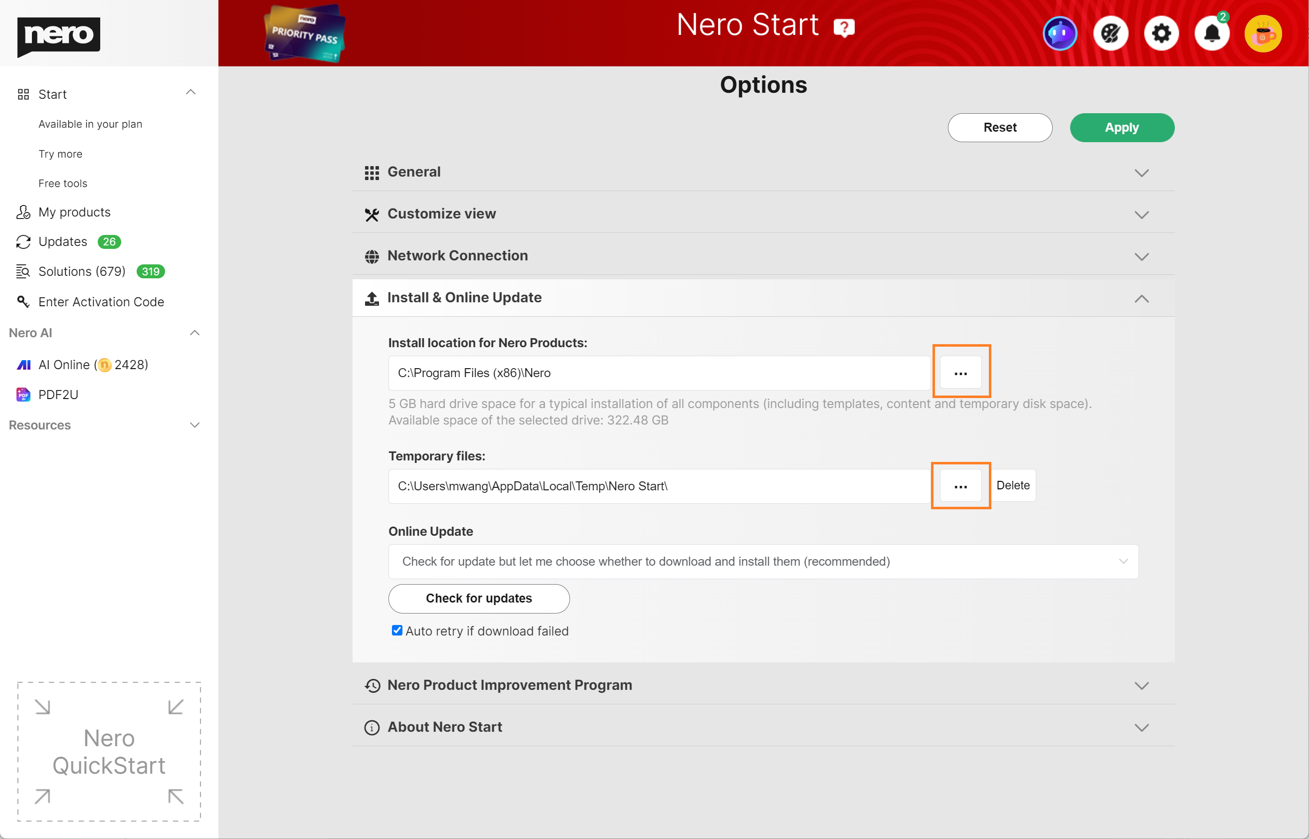 - Modifiez les chemins "Emplacement d'installation des produits Nero" et "Fichiers temporaires".
