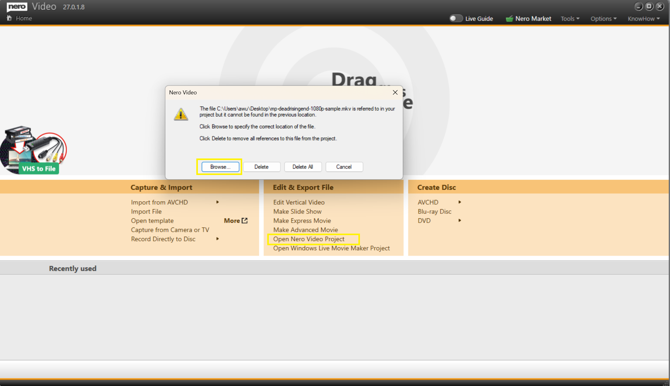 3. Recherchez et sélectionnez votre fichier .nvc et les fichiers multimédias sources s'ils ne sont pas automatiquement liés.