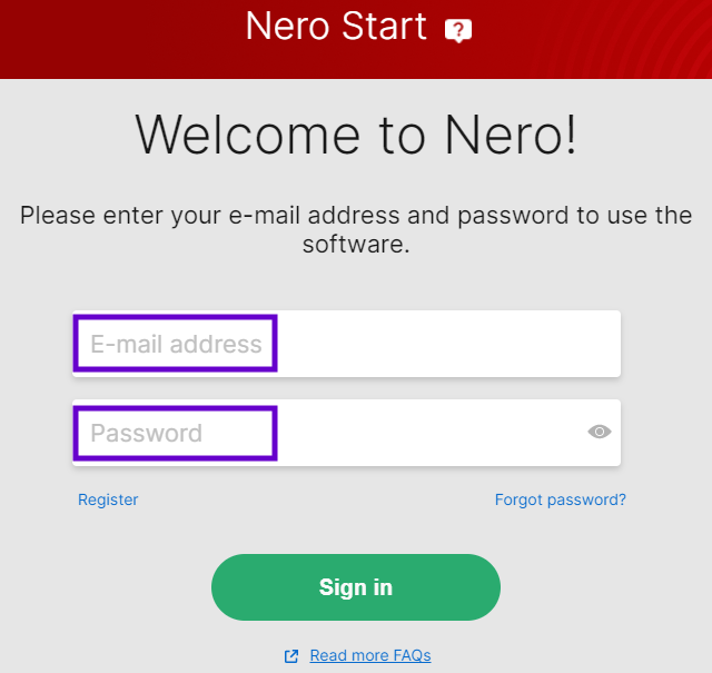 1. Apri Nero Start, inserisci l'indirizzo e-mail registrato e la password riportati nell'e-mail di attivazione.